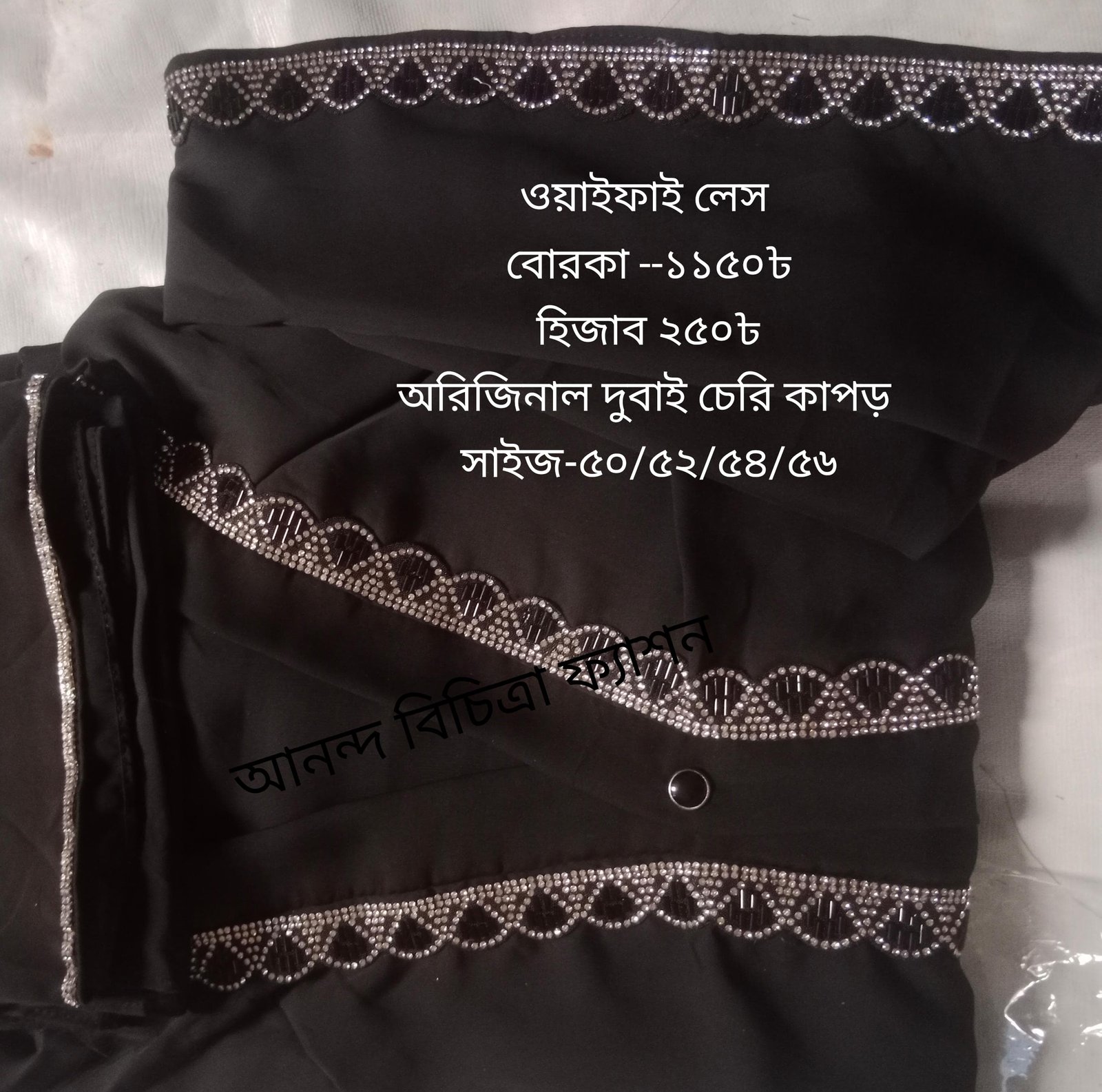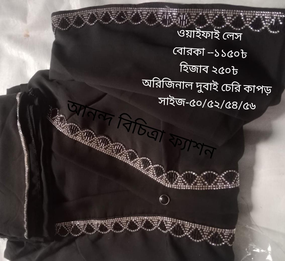 ওয়াইফাই বোরকা 1150 হিজাব 250 অরিজিনাল দুবাই চেরি কাপড় সাইজ লম্বা -50/52/54/56 বডি ফ্রি সাইজ কালার একটাই(শুধু কালো)